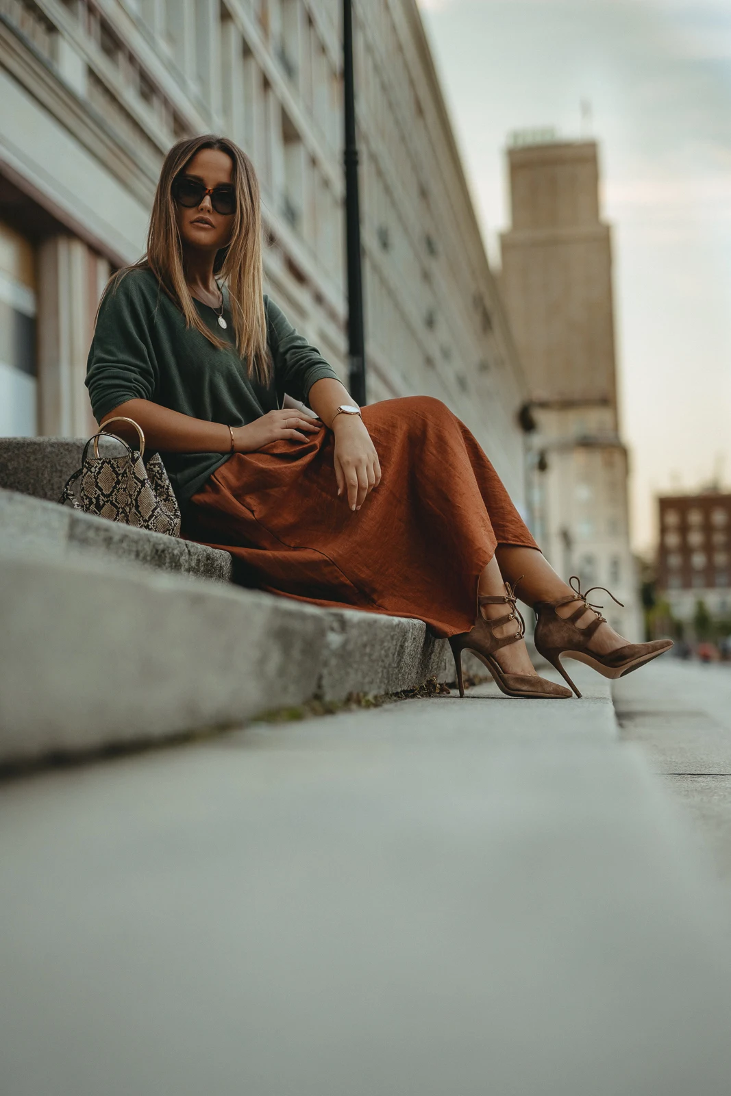 Miedziana spódnica midi totalnie mnie zauroczyła. Od razu widziałam ją w towarzystwie khaki. Muszę przyznać, że wygląda równie świetnie z klasycznym, białym T-shirtem i trampkami. Też już czujecie jesień? Powoli zaczynam uzupełniać garderobę. Macie już swoją #autumnWishlist? Ja poluję na beżowy, długi kardigan do letnich sukienek. Wieczory już niestety mamy chłodne.